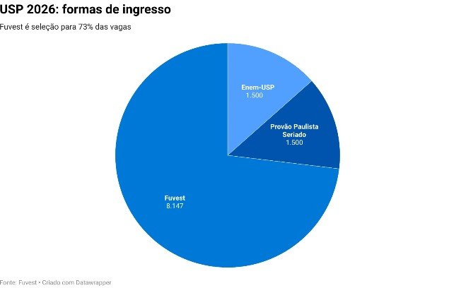A Fuvest seleciona alunos para 73% das vagas oferecidas pela USP em 2026 (veja gráfico). Também é possível ingressar na universidade de outras duas formas: com o Enem-USP e o Provão Paulista Seriado. Ao todo, 3 mil vagas serão destinadas a essas formas de seleção, sendo 1,5 mil para cada uma delas.